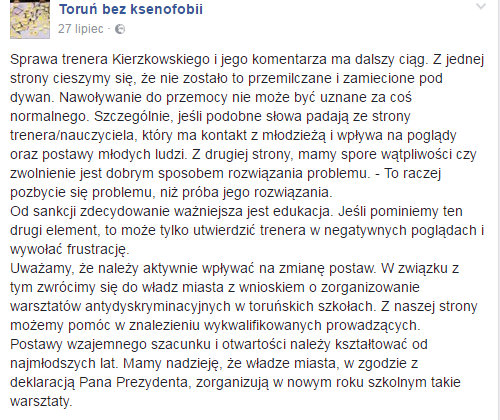 Warto podkreślić, że znana antyrasistowska organizacja Toruń bez ksenofobii nie do końca podzielała decyzję o zwolnieniu trenera.